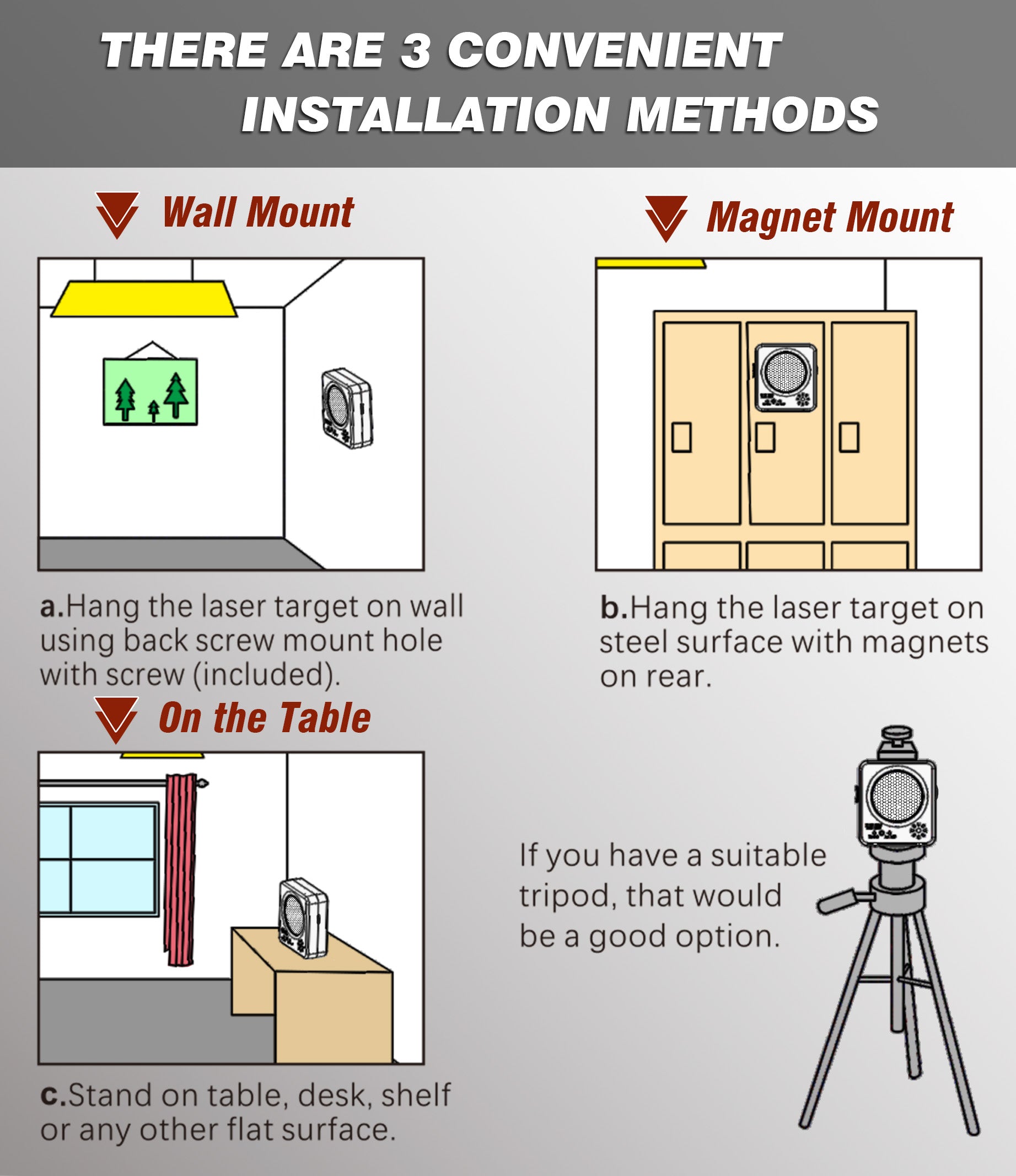 - Multiple installation and training levels: The target is portable, supported on a table, on the wall, and with magnets on iron. The different film covers will be used to set the training level.