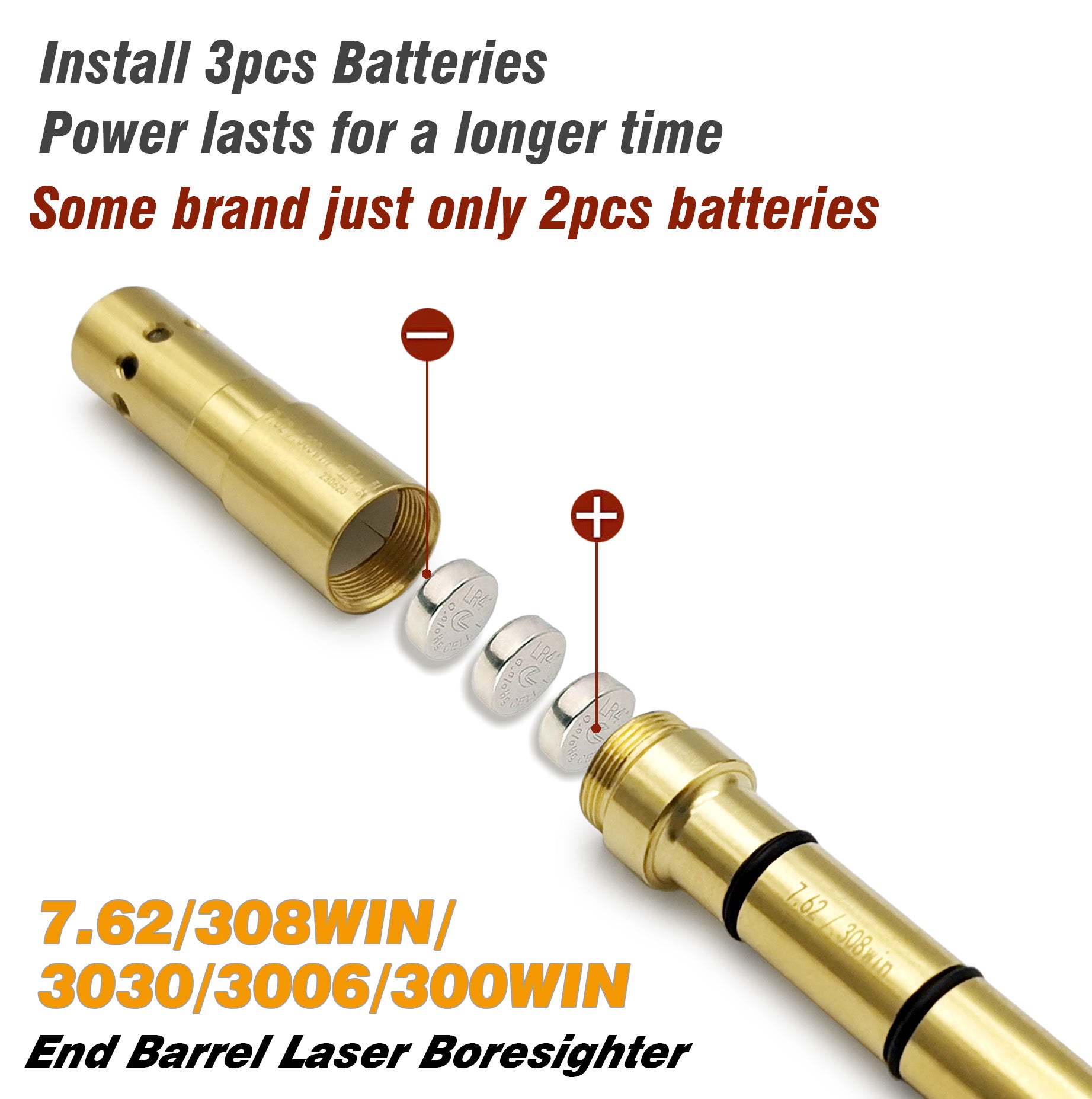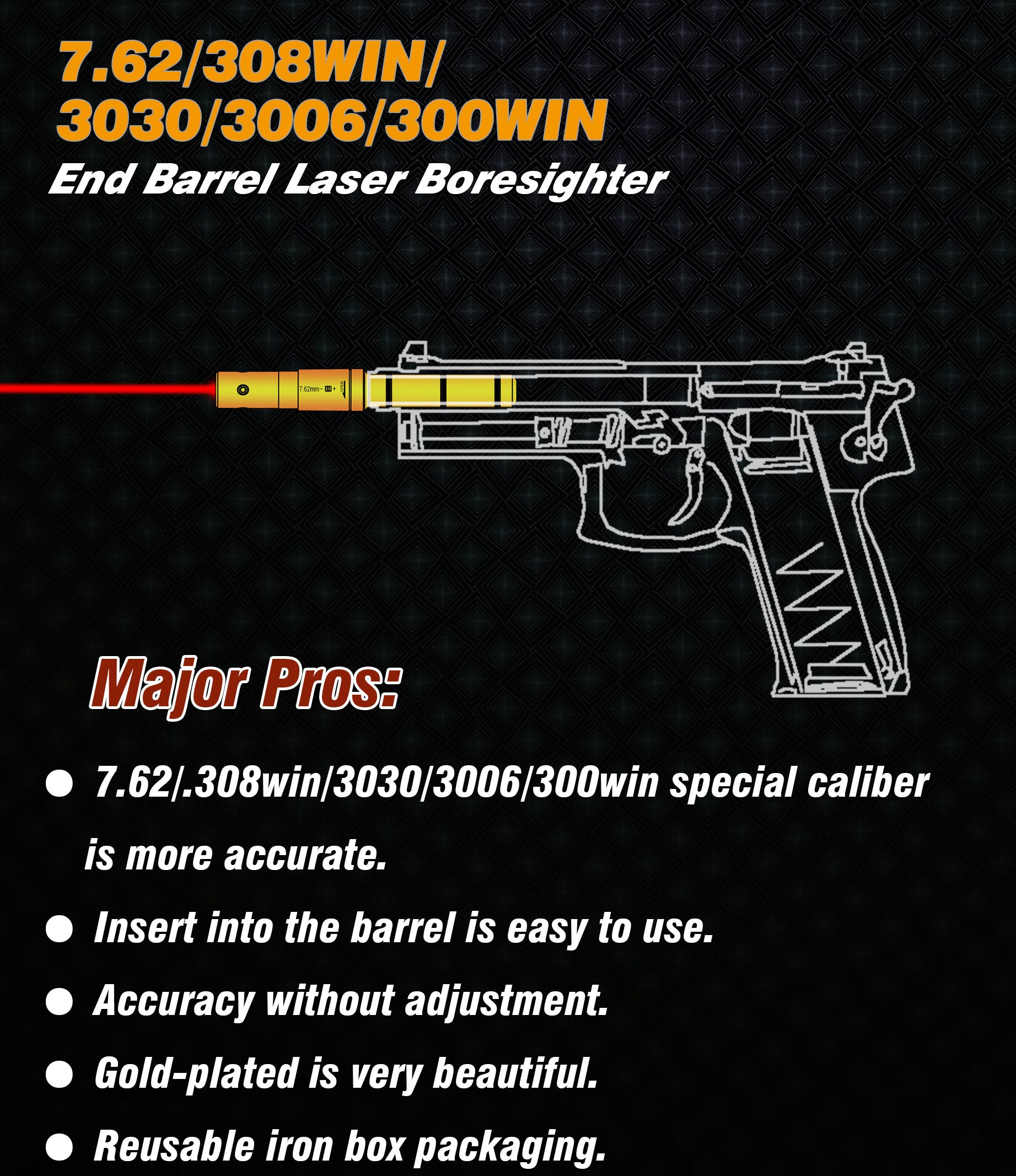 This is a special laser boresighter for the 7.62MM/300/308/30-30/30-06 caliber pistol or rifle. It is inserted directly into the barrel and it is so easy to use. This tool helps you to adjust your sight or scope and set your firearms on the target quickly.