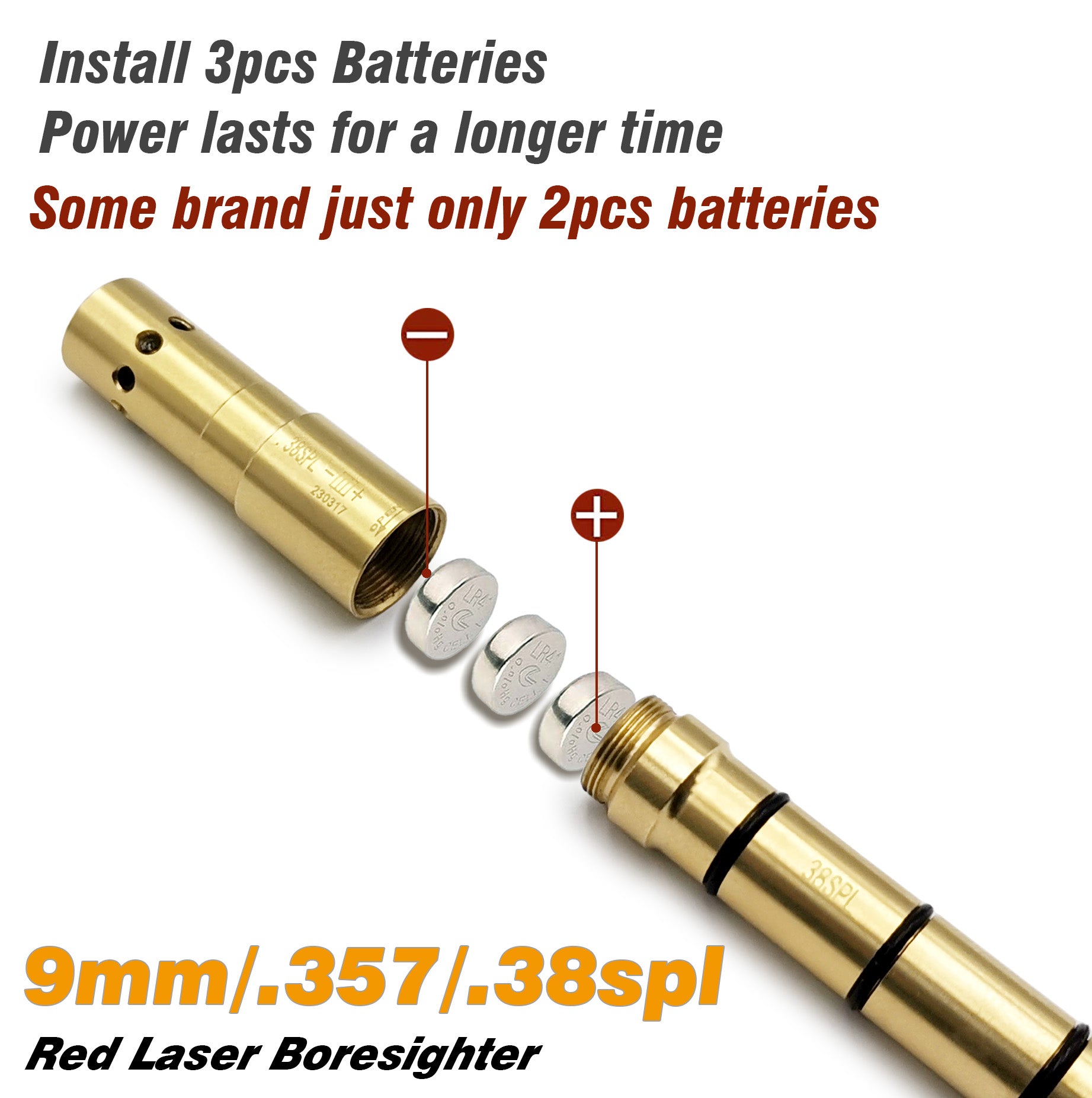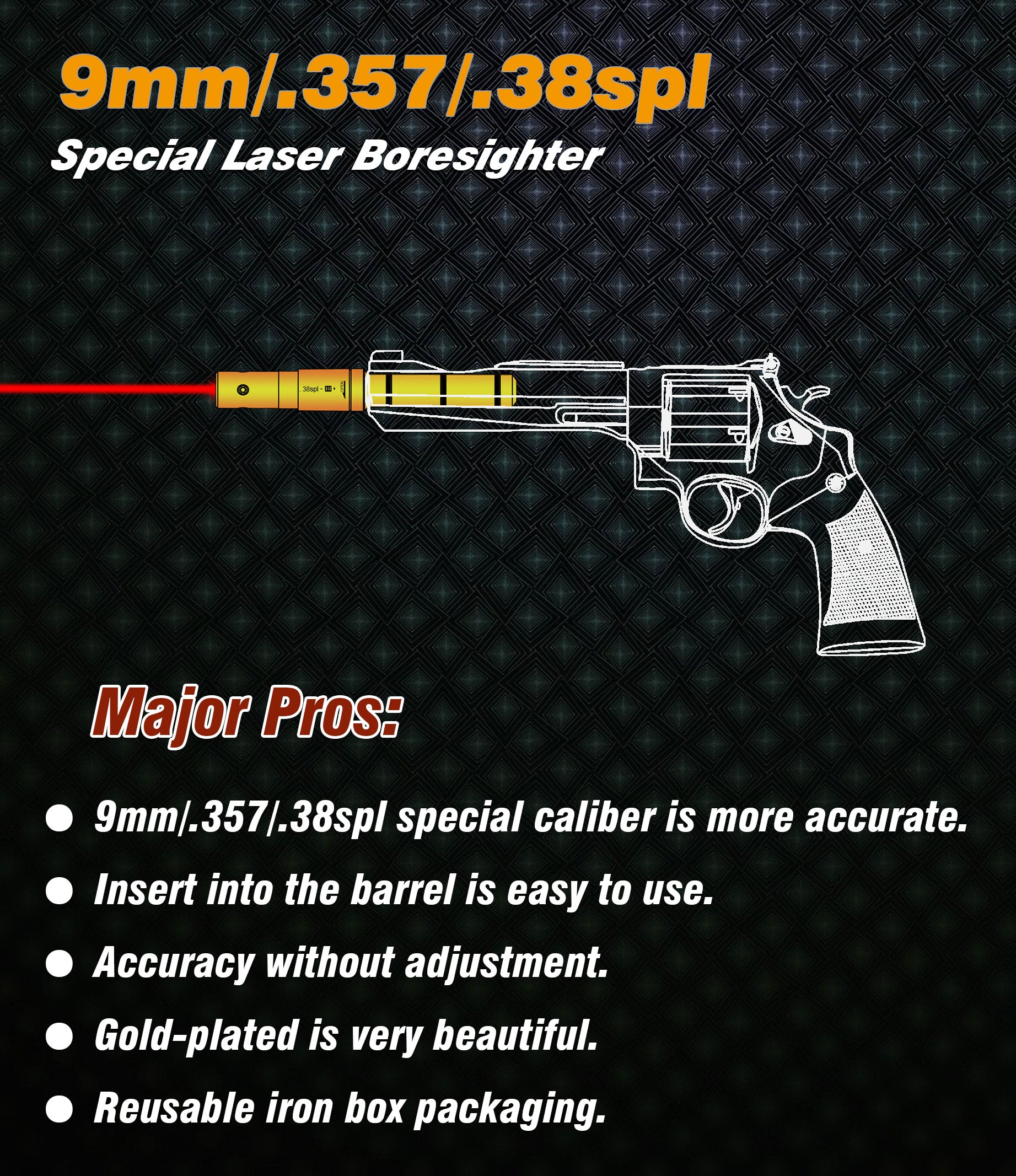 This is a special laser boresighter for the 9MM/.38SPL/.357MAG/.380AC Pcaliber pistol or rifle. It is inserted directly into the barrel and it is so easy to use. This tool helps you to adjust your sight or scope and set your firearms on the target quickly.