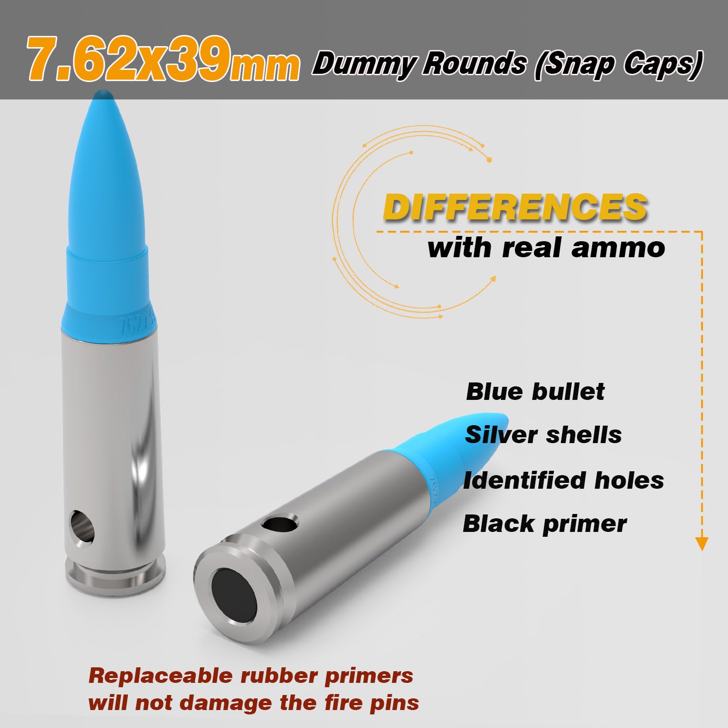 - Silver metal case with hole and Bright blue plastic tip make the round highly visible. When loaded, these inert dummy training rounds give your magazine a near-normal, fully-loaded weight (just like live rounds), giving you a realistic training experience.